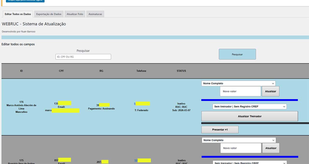 A tela de Gerenciamento de Usuários, na entrada já exibe os 10 últimos cadastros de usuários e, ainda que pouco rebuscada, tem todas as ações principais citadas acima: De controle de usuários, alteração de qualquer dado, com verificação de campos nulos. Além disso, permite pesquisar por ID, CPF, RG para alteração de um usuário específico.
