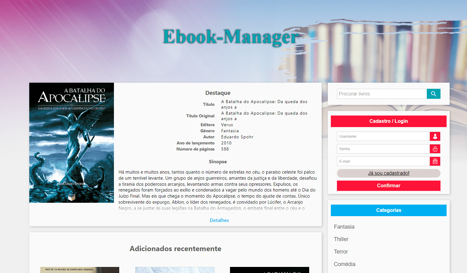 Com um um livro de destaque que se atualiza a cada 3 dias, uma tela de login, últimos livros adicionados e mais lidos, esse é a página inicial. Todos os gêneros, categorias são cadastrados no banco de dados podendo ter fácil adição de novos.