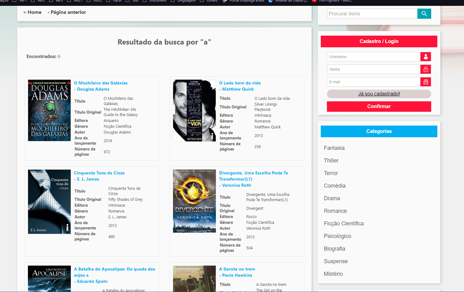 Este é a tela de busca de livros, onde trás os livros. Eu fiz uma query onde me traria resultado com o nome do autor, e do livro. Também coloquei filtros de data de lançamento e e ordem alfabética.
