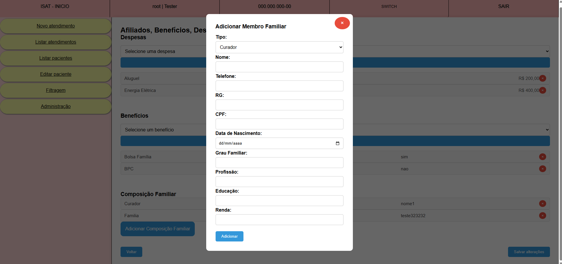 Nesta tela podemos ver que despesa/benefício são adicionados ao usuário paciente, ambas essas listas são carregadas via fetch API, já previamente adicionadas em uma tela de adição. Neste `modal` já podemos verificar uma adição de familiar/entre outros, com botão de fechar caso desista. Nesta tela, todas as adições podem ser feitas em conjunto, muitas despesas, muitos benefícios ou muitos familiares, para então serem adicionados ao Banco de dados.