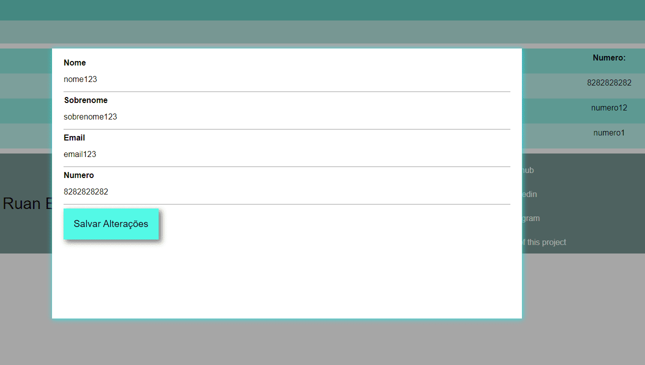 Ao clicar em Editar, me dei o outro desafio, criar um modal e imprimir o mesmo formulário do cadastramento. Também conclui com sucesso, foi aqui que precisei usar bastante as props do react, apesar de ter feito todos os meus próprios desafios, e ter ficado completo, me dei uma pausa sobre React, precisaria aprender mais sobre boas práticas, não usar de recursos de má programação.(Digo isto porque criar um contextmenu de uma lista, que passa o id do contato, para um outro modal que, foi bem trabalhoso pra um iniciante em react haha)